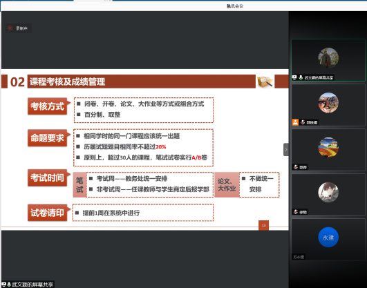 为加强本科教学管理,提高本科教育教学水平,规范教学活动,树立红线意识,预防各类教学事故的发生,4月27日上午,人文与社会科学学部举办了两场本科教学培训交流会。学部主管本科教学的副部长武文颖教授、60多位一线教师和教务办老师参加了会议,交流会采用腾讯会议和学习通的线上方式进行。