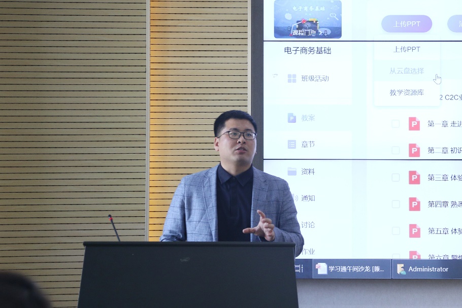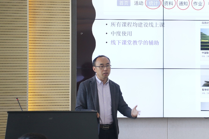 超星任玺霖为与会教师演示了超星学习通平台的权重分析、作业和考试的明细分配、题库的题型管理、教学资源库的更新等新版功能,并针对教师们对作业作品抄袭情况的审核、部分内容无法设置任务点等问题进行了一一解答。