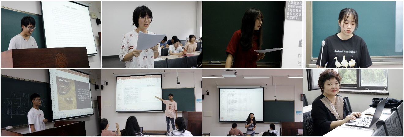 7月12日下午3点,一馆209,马克思主义学院的肖唤元、张晗、朱琳琳、梁大伟、薛晋锡五位老师,80名大一新生以小组汇报的方式参加本次活动。通过PPT展现学生对《毛泽东选集》、《邓小平文选》、《习近平谈治国理政》、《马克思为什么是对的》和《近代中国社会的新陈代谢》五本阅读书目的深刻理解。汇报现场,有的学生围绕马克思主义的发展历程分享观点,从毛泽东思想对马克思主义的继承与发扬,到邓小平理论的开拓创新,再到今天习近平新时代中国特色社会主义思想的探索,马克思主义之所以具有科学性,就在于它在实践中得到了不断的丰富和发展。有的学生则对近代中国经历的改良与革命充满兴趣,认为近代中国在社会的曲折中完成了一次次的蜕变。老师们认真耐心的听取学生的汇报并进行点评。