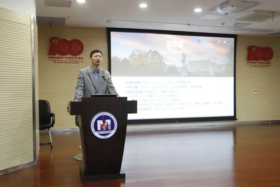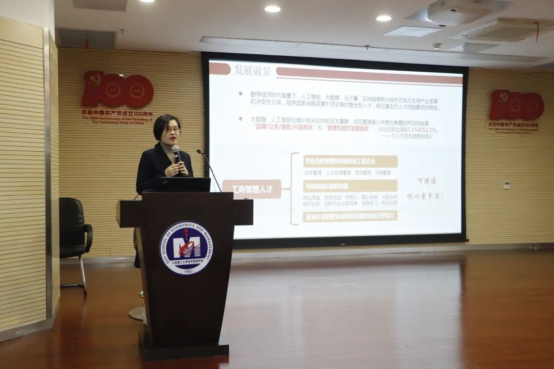 首先进行专业介绍的是来自工商管理专业的于淼副教授。于老师介绍了工商管理专业悠久的发展历史、良好的学科基础、雄厚的师资力量以及学生广阔的发展前景。于老师特别强调,工商管理专业的特色在于基础厚重、价值引领、关注前沿、交叉融合、扎根实践,以学生成长为中心,专注学生核心能力提升,力求培养具有专业素养、创新精神、家国情怀、全球视野、引领社会发展的高级管理人才。