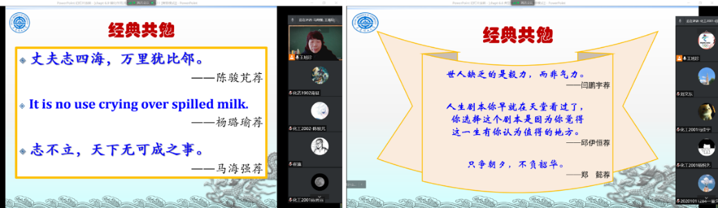 经典共享,助力成长。课前增设“经典共勉”互动环节,由学生轮流介绍对自己影响最大的励志名言及推荐理由。这些选自中华古诗文、科学家、作家等的名言警句,结合青年学生个人成长历程中攻坚克难的亲身感悟,很容易引起同龄人的共鸣,起到相互激励的作用。每次课堂有2-3位同学被“盲选”,增加了学生上课的兴奋感;同时也为学生提供了锻炼口头表达能力、展示思想和志趣的机会。而且,通过他们的讲述,有助于增进其他同学与个体学生的彼此了解、加深友情;教师则会被触动、有感而发,给予深情的评述,一次又一次为学生们营造向上向善、坚定目标、积极进取、健康成长的良好氛围。