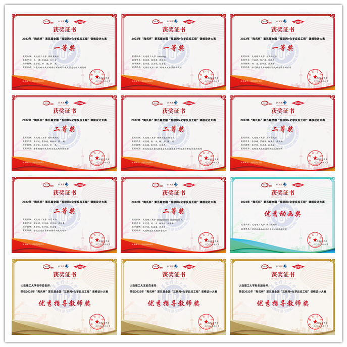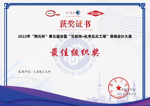 2022年8月23日,由中国化工学会主办,华东理工大学承办的2022年 “陶氏杯”第五届全国“互联网+化学反应工程”课模设计大赛落下帷幕。本届比赛共有来自25个省市自治区、84所高等院校、354支队伍报名参加,本届比赛是历届参赛作品数量最多、作品水平最高的一届,大赛竞争十分激烈。经过专家初评、终评和会议评审等程序,评出作品奖项125项(一等奖18项、二等奖38项、三等奖62项、鼓励奖7项),优秀案例奖5项,优秀动画奖5项,最佳组织奖7项,优秀指导教师奖10名。我校有八支队伍在强手如林的参赛队伍中脱颖而出获得佳绩,共获得一等奖三项、二等奖五项、优秀动画奖一项、三名教师获得了优秀指导教师奖,同时我校还获得了最佳组织奖,在获奖数量和获奖等级上在所有参赛学校中都居于前列。下面是我校获得的奖项和证书: