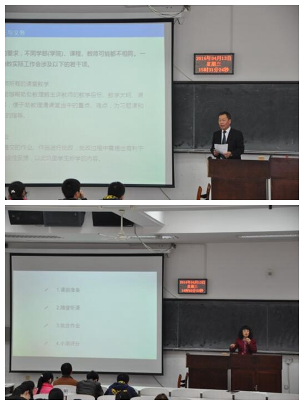 本次培训会邀请数学科学学院金正国教授和马克思主义学院的陈晓晖副教授为研究生助教进行了专题培训。培训主要围绕“助教的责任和义务”和“如何协助教师助课”两个方面展开,金教授就研究生助教工作过程中“答疑,有效沟通和交流”、“批改作业”和“习题课教学实践”等环节进行了详细的讲解,还特别强调了研究生助教工作在本科生人才培养中的优势及特点,提出新聘助教要切实提高认识,积极参与本科教学实践,从而更好地提升本科生的学业兴趣。陈晓晖副教授从助教工作内容、岗位职责以及如何做好助教工作等方面谈了自己从教多年的切身感受,详细讲解了批改作业、组织小班讨论和实践汇报的方法与技巧,并强调了助教工作中应注意的问题。