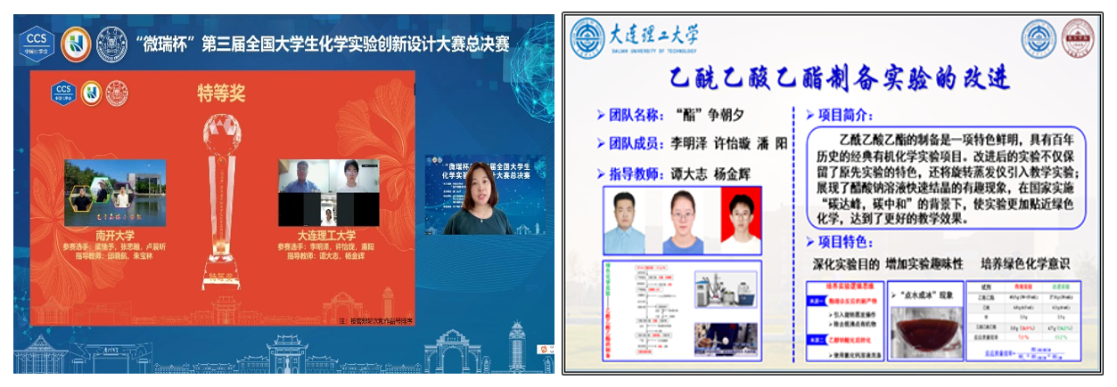 受疫情影响,总决赛采取线上评审、答辩的方式进行,经过两天的分组答辩评审和集中答辩评审,共评出特等奖18项,一等奖33项,二等奖39项。我校谭大志、杨金辉老师指导的“酯”争朝夕队喜获特等奖。这也是自2019年该赛事启动以来,我校代表队再次获得全国特等奖。