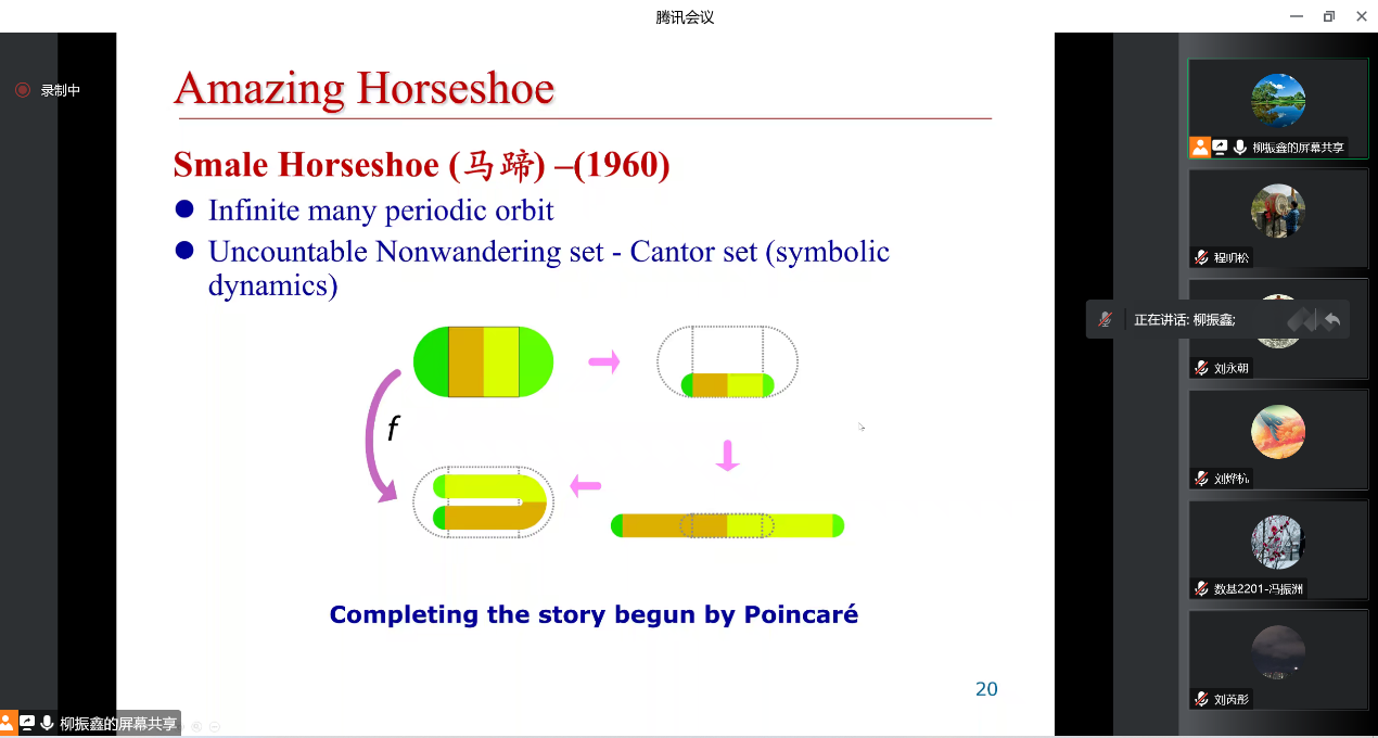 最后,柳振鑫介绍了自己和合作者在动力系统方面取得最新研究进展,并总结了动力系统领域的重要研究方向。柳振鑫教授勉励各位同学要认真学习,充分利用当下时间,将来为我国数学学科的发展做出贡献。