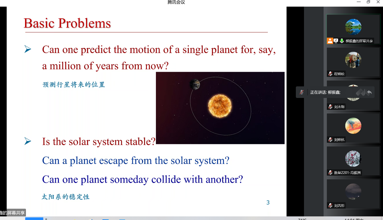 动力系统主要研究系统随时间变化而演化的规律。关于动力系统的研究,可以追溯到19世纪末Poincare关于N体问题的研究。柳振鑫教授首先从最简单的微分方程开始介绍,从单摆的运动规律、太阳系天体运动规律逐渐过渡到三体问题以至N体问题,介绍了开普勒(Kepler),牛顿(Newton)等在研究天体运动过程中得到的数学方程和数学规律,深入浅出地介绍了庞加莱(Poincare)、柯尔莫哥洛夫(Kolmogorov)、伯克霍夫(Birkhoff)、斯梅尔(Smale)等在动力系统发展过程中做出的伟大贡献。