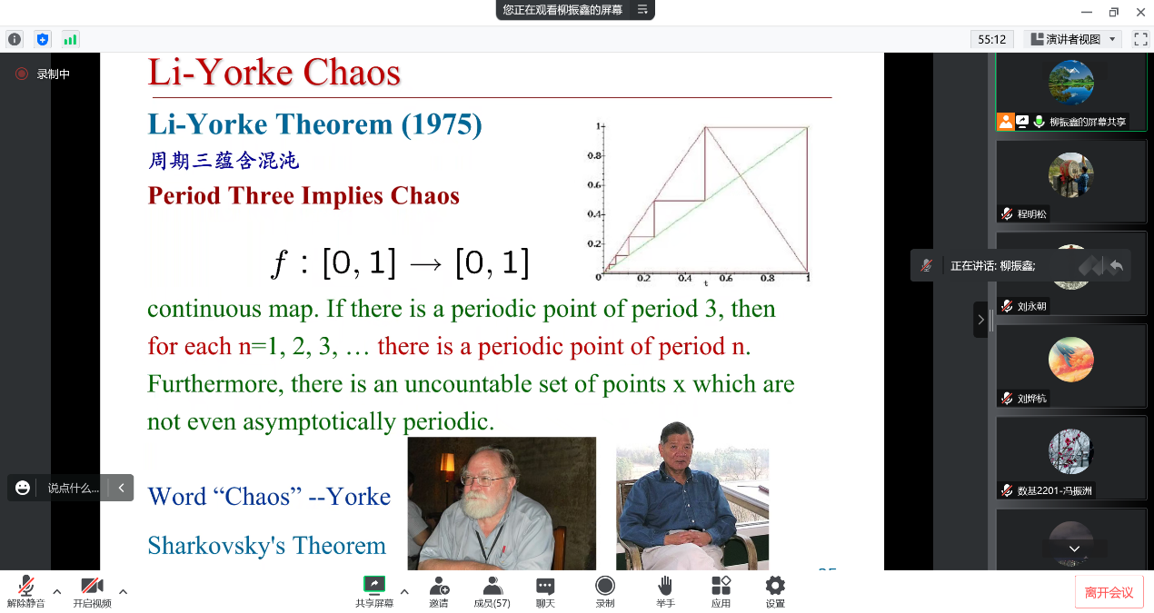 柳振鑫教授介绍了旅美华人数学家李天岩教授在“混沌”中做出的杰出贡献。1975年12月李天岩教授与导师约克(Yorke)在《美国数学月刊》杂志上发表论文“周期三蕴含混沌”在数学中第一次引入了“混沌”的概念。李天岩教授超过三分之二的人生都是在和疾病的奋战中度过的,但他在数学领域取得了巨大的成就。柳振鑫教授号召大家向李天岩教授学习。