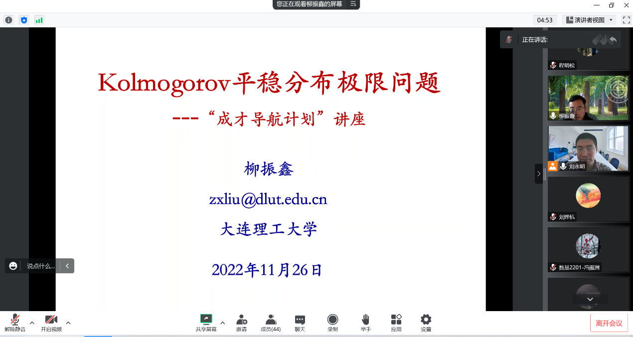 为培养拔尖学生对数学的兴趣,树立远大志向,启发科研思路,2022年11月26下午14:00-15:00,大连理工大学数学科学学院院长柳振鑫教授做客拔尖人才培养“成才导航计划”系列讲座,以“Kolmogorov平稳分布极限问题”为题,作了关于动力系统领域的科普报告。