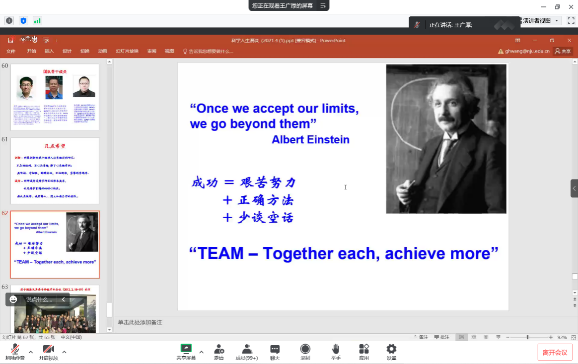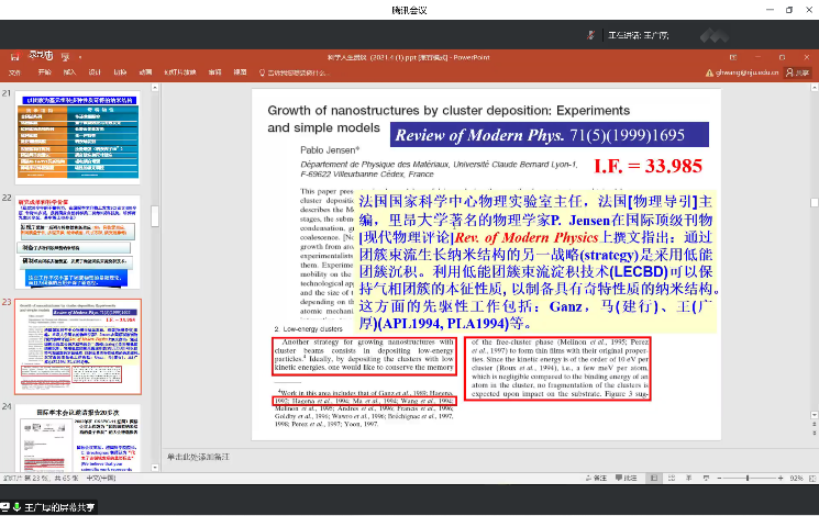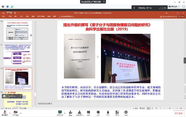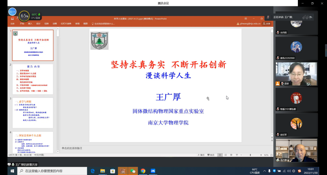 为了帮助同学们树立正确的人生观、价值观,激发同学们的科研斗志,2022年11月30日10点,大连理工大学教务处在线上举办了“成才导航计划”系列讲座,我们特别邀请到国家自然科学二等奖、胡刚复物理奖获得者王广厚院士主讲本次的名师讲堂。本次讲座由教务处副处长吴硕主持。王广厚院士结合了自身的科学研究艰辛探索以及国际学科前沿和课题组的发展历程与科研成果,介绍了原子团簇与原子制造的概念、关键科学问题与未来发展趋势。分享了在科研道路上开拓创新的科研精神、科研追求和人生感悟。本次的名师讲堂吸引了师生的广泛参与,共计170余人参加。
