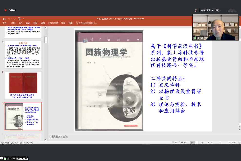 王广厚院士从自己的贫寒求学之路讲起。凭借优异的成绩,王广厚院士一路披荆斩棘,在那个吃饱饭都是奢望的年代里,凭借对知识的热情和对报效祖国的一腔热血成功从小镇考上了北京师范大学。最终,在综合考量了国家需要和个人志愿后,王广厚院士决定走上科学研究的艰辛道路。1976—1987年,王广厚院士用核技术研究固态物质的结构和性质,用正电子淹没谱研究聚合物和高温超导体辐射缺陷,并在共振核反应和沟道效应研究晶体缺陷分离等方面取得了成效。不仅如此,在阅读大量资料、消化和吸收已有研究成果的基础上,他完成了百万字的两卷本专著《粒子同固体相互作用物理学》,紧接着又将自己的研究成果提炼、总结,把理论与实验紧密结合,写出了一本60万字的专著《团簇物理学》。