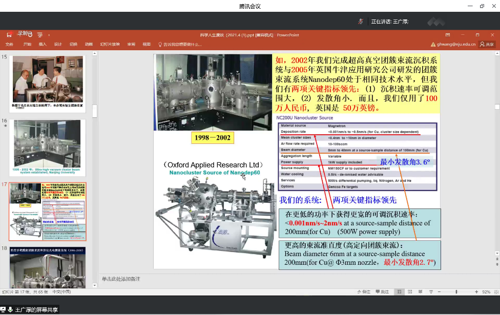 在八十年代,王广厚院士大胆选择了新兴学科的新研究课题——原子团簇,成功发现了离子簇同位素效应并发表一系列高水平论文。看似寻常最奇崛,成如容易却艰辛,谁能想到如此前沿的研究成果竟是在无实验室、无经费、无人员,工作室不足十平米的“三无”条件下诞生的。艰苦的条件磨灭不了科研的热情,什么都没有?好,我们自己造。王广厚院士等人自行研制了多种类型的团簇束流装置、自主进行了纳米团簇的制备和组装、采用实验理论结合的方法研究了团簇及其组装体系的奇特结构和物性,为设计和制造新的纳米结构与量子器件打下了坚实的物理基础。1992-1994年,王广厚院士等人将学校分析中心四楼的一个厕所改造成LECBD实验室,自行设计并建造了第一代团簇束流装置——低能团簇束流装置,这也是国际上最早具有类似功能的团簇实验设备之一。