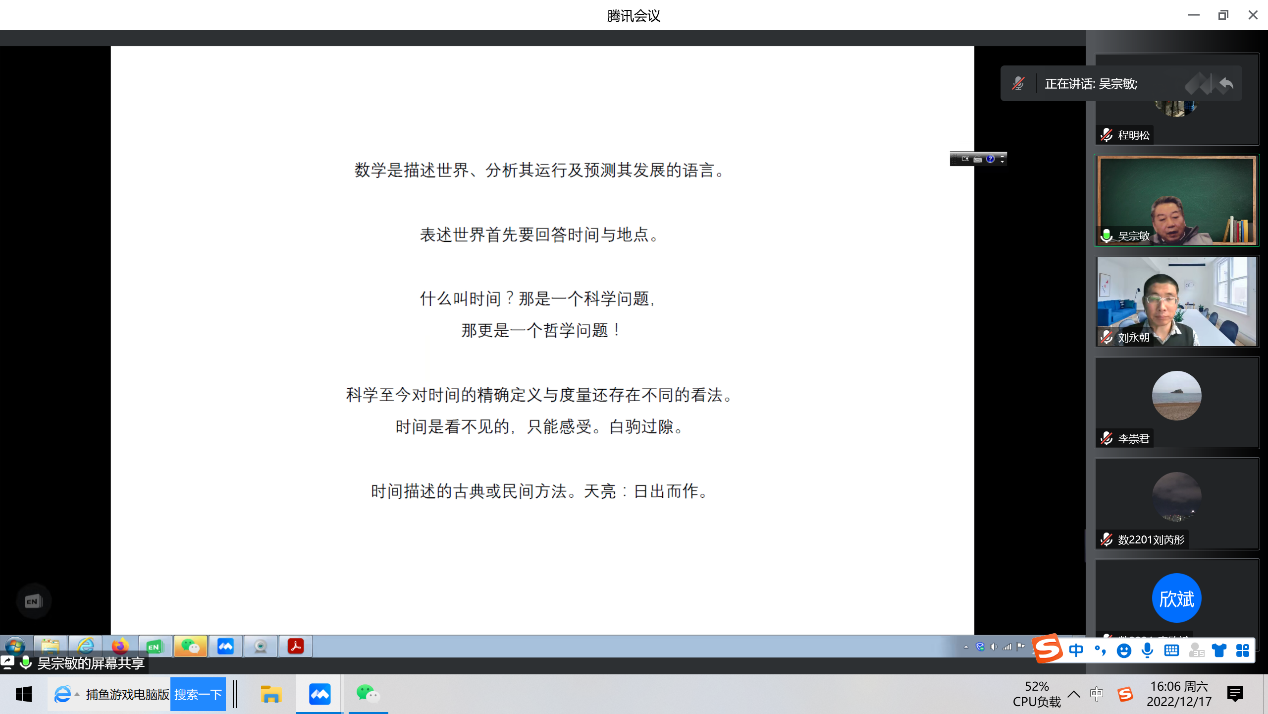 吴宗敏教授首先介绍到,时间是什么既是一个科学问题,也是一个哲学问题。目前为止,科学界对时间的精确定义和度量还存在不同的看法。任何问题,或者说事件,数学上称为“点”,都是与时间,地点联系在一起的。从数学的角度来说,时间是一个必不可少的维度,在我们人类所处的三维空间中加上一维时间,就变成了四维空间。人类的生活活动都是在包含时间的四维空间中进行的,比如,新冠病毒的传染防控就是从时空的角度去考虑问题。
