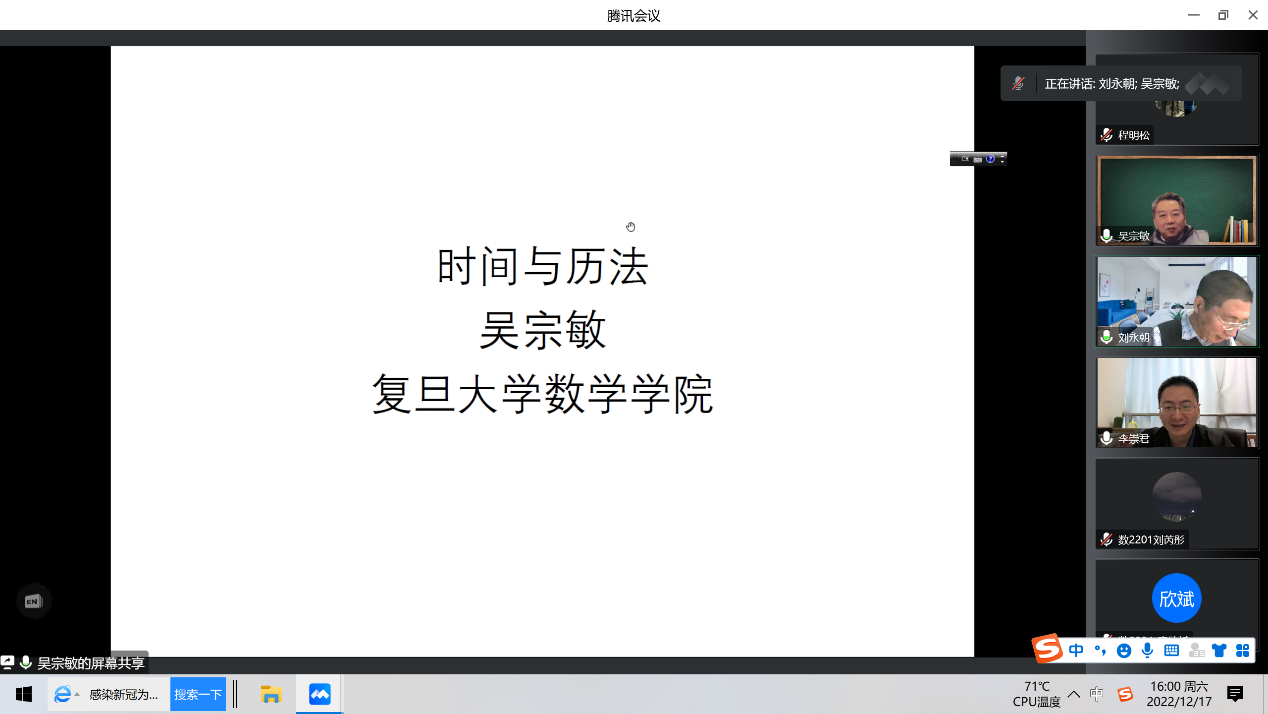 为培养拔尖学生对数学的兴趣,开阔学术视野,启发科研思路,2022年12月17日下午16:00-17:00,大连理工大学数学科学学院邀请了复旦大学数学科学学院吴宗敏教授做客拔尖人才培养“成才导航计划”系列讲座,以“时间与历法”为题作了精彩的数学科普报告。