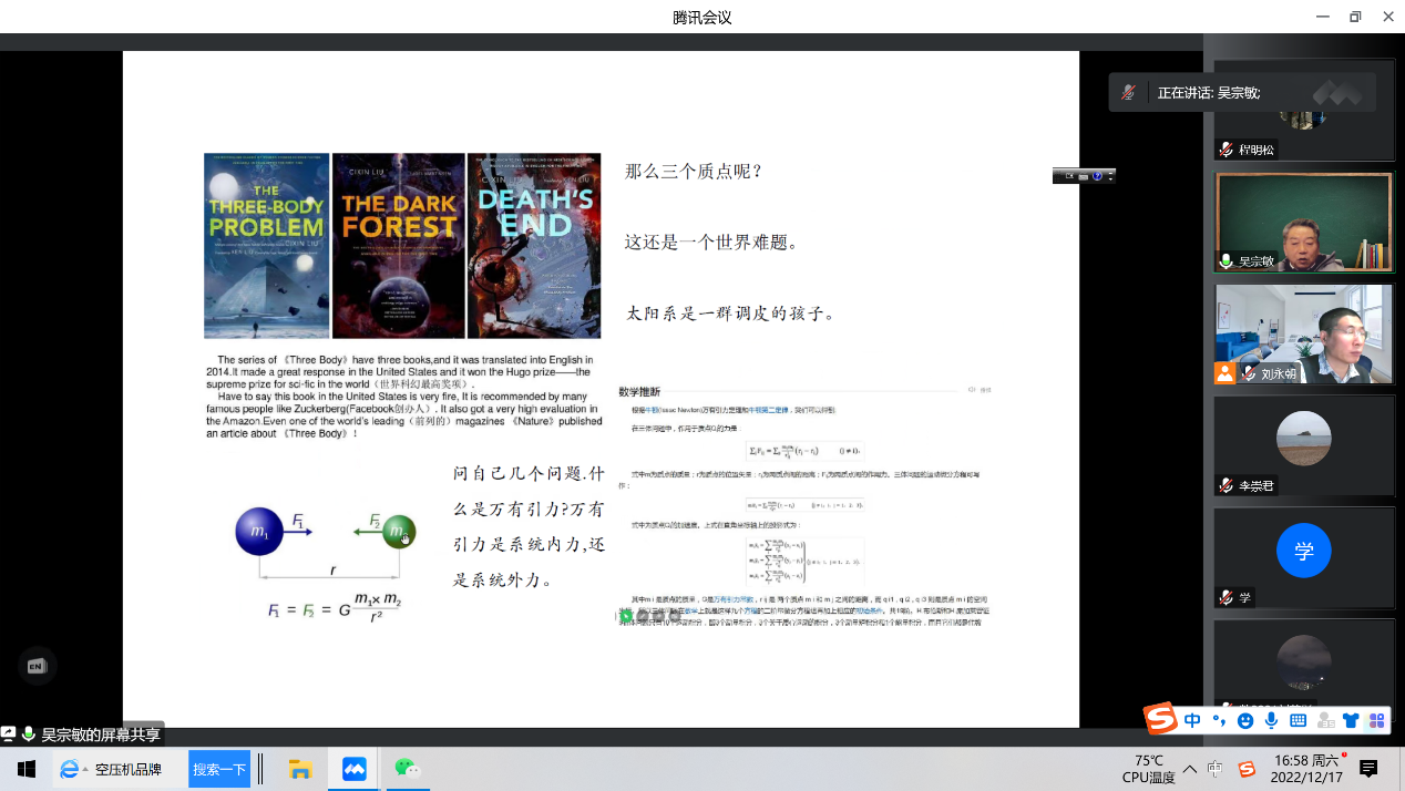 最后,吴宗敏教授以天体运行作为例子,讲述了地球绕着太阳转、如何飞出太阳系,也就《三体》、《流浪地球》等热点话题给出了自己的看法。吴宗敏教授指出,上述天体运动从数学的角度看就是动力系统,并鼓励同学们要认真学习,充分利用当下时间,将来为我国数学学科的发展做出贡献,为国家解决卡脖子问题做贡献。