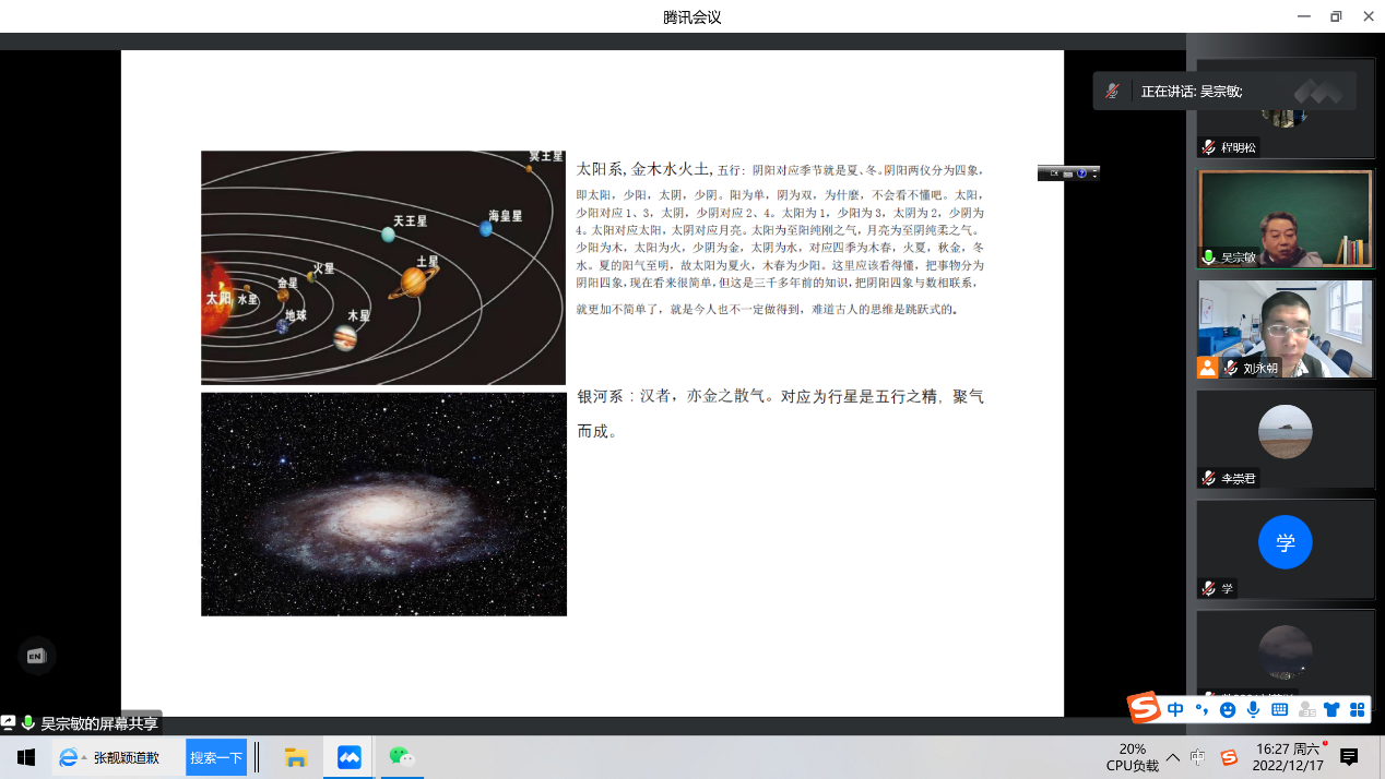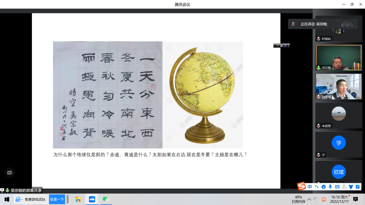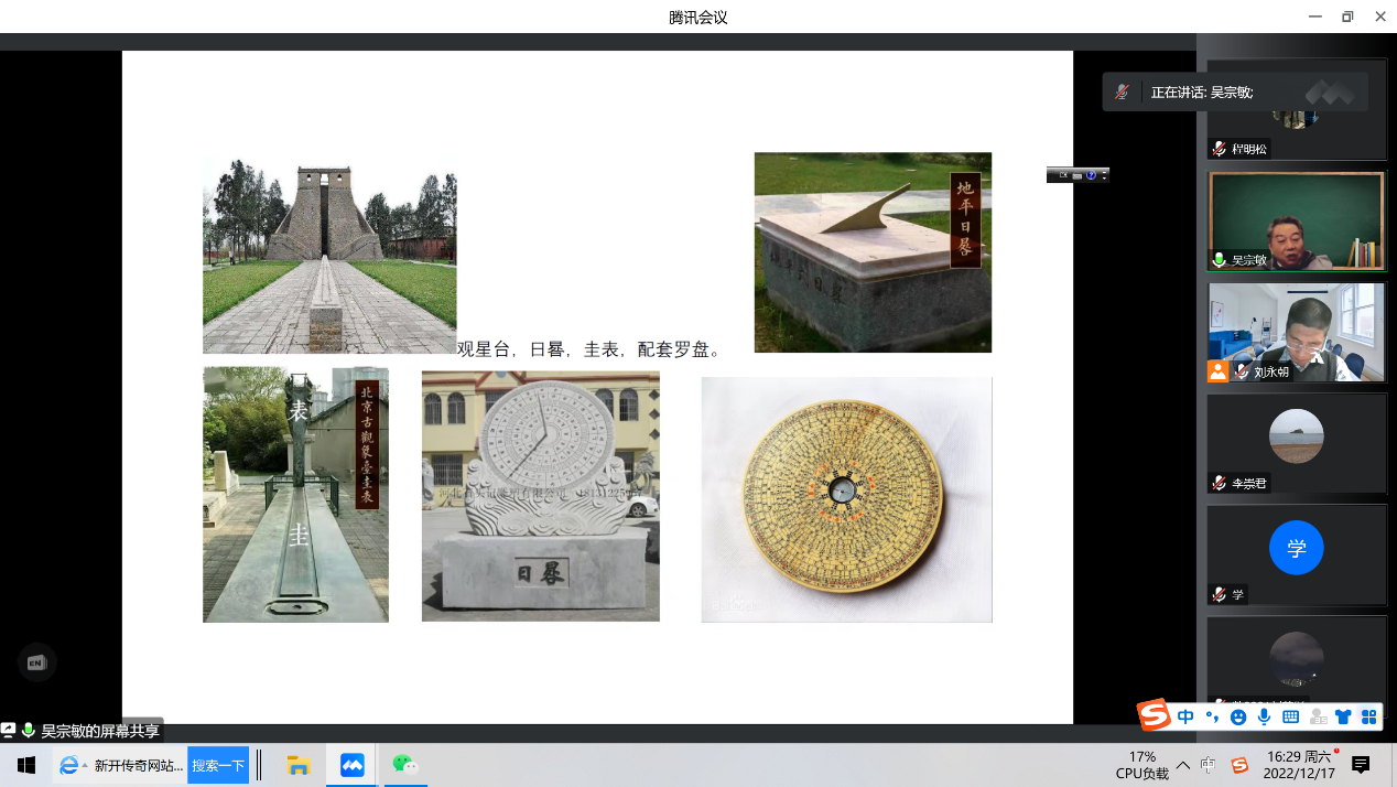 吴宗敏教授利用自己写的这首诗结合地球仪详细解释了地球上的时间是怎么计算的,并从太阳系与其行星与中国阴阳五行对比,进而阐述了古代中国在历法方面的成就。上图中的圭表、日晷等都是中国古代观测天象的仪器。
