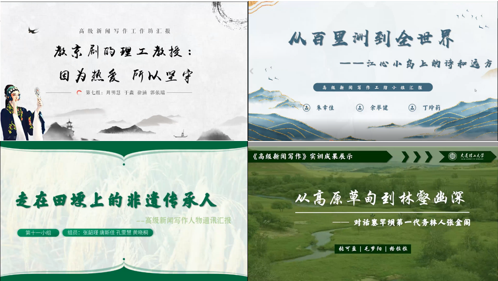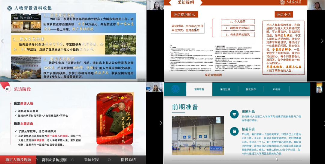 人物是时代的精灵,人物通讯是新闻报道的重要类型。汇报开始后,同学们从人物选题、人物采访、通讯撰写、作品呈现、总结反思五个方面对自己的人物通讯作品进行了详细的介绍。在人物选题方面,同学们首先找寻身边人的故事,采访对象十分多样。如第四组同学采访了婺剧戏服老艺人徐裕国并走进徐老与婺剧的故事,在人物通讯作品中呈现了一个一生只爱一件事的婺剧戏服老艺人形象。第七组同学采访了大连理工大学电信学部的退休教授、大连理工大学京剧社社长何熙文,同学们进行实地采访并深入何老师的京剧课堂,在通讯作品中向读者讲述了这个热爱京剧、坚守课堂的理工教授的故事。第九组同学采访了塞罕坝第一代务林人张金阁,在作品中概述了塞罕坝的变迁,通过“六十年、三代人、一件事”的故事折射出张金阁及其家庭上延续的塞罕坝精神。