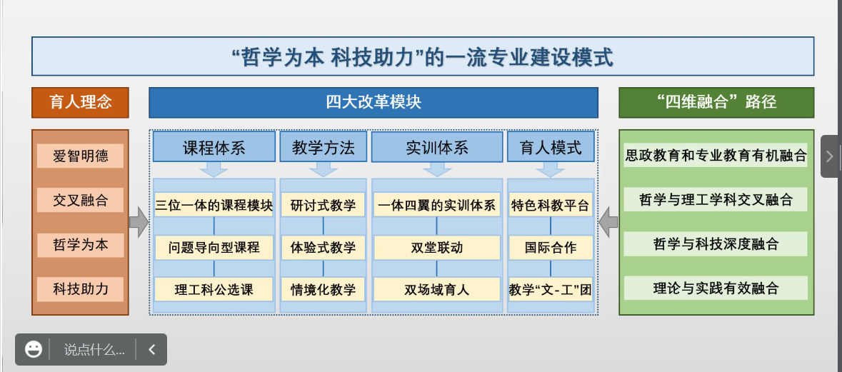 哲学系主任徐强副教授指出,哲学系以“立德树人”为根本,基于“爱智明德、交叉融合、哲学为本、科技助力”的培养理念,以“四维融合”为突破口,形成“一根本四融合”的培养路径,通过对“体验式教学理念”、“情景式教学方法”的发掘与实践,着力探索以“哲学为本、科技助力”为明显特征的哲学一流专业建设的“大工模式”。