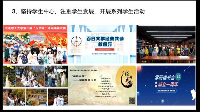 中文系主任王玉春副教授从整体布局、多措并举加强建设,优化创新、持续推进专业建设,厚积薄发、一流专业建设成效,奋笃行、建设国家一流专业四方面汇报汉语言文学一流专业建设成果,对中文系立足于大文科视野完善育人机制,优化课程资源、重经典强写作、深化研教结合的情况进行说明,不断夯实学生专业基础能力、强化文学鉴赏与写作能力、提升实践创新能力。