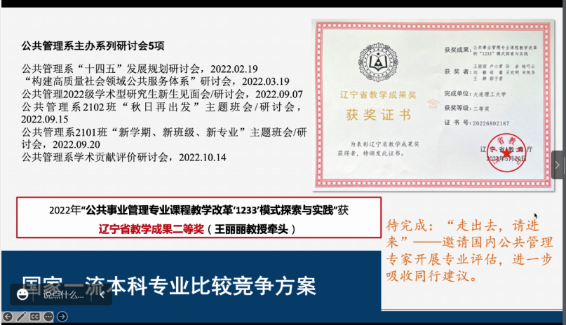 公共管理系主任刘毅教授从一流课程建设+课程思政、科学研究+社会服务、招生+就业+人才培养三部分对公共管理一流专业建设情况进行分享,一方面对国家一流本科专业比较竞争方案、课程思政一流课程培育计划等专业师生取得的成就进行总结,以东北地区公共管理学术网络建成等实际案例呈现公共管理系在搭建多方协同育人平台载体上作出的努力;另一方面也指出在国家级一流课程维护支持不足、核心竞赛传帮带组织等工作仍存在着亟待解决的问题,也成为未来的完善与改进方向。