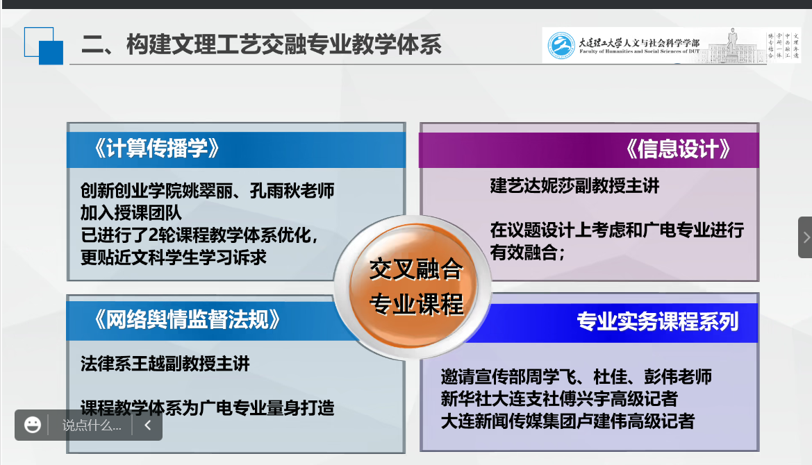 新闻与传播学系主任王爱玲副教授结合《高级新闻写作》、《电视编辑与制作》、《计算传播学基础》等专业课程的产出实际,介绍了当前新闻与传播学系在新文科赋能专业一流课程建设与学科交叉融合与专业创新实践,并将不断探索多主体授课、跨专业协同、文工深度交流的新文科建设方式,持续促进现有师资教学科研实力提升、进一步凝练“理工”特色、持续扩大专业及学位点整体影响力。