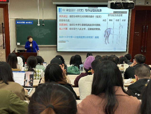 武文颖副部长主要从毕业论文(设计)工作具体目标、工作流程、时间节点、过程管理举措、过程检查要求这五大板块进行了讲解。她首先从剖析毕业论文写作过程的乱象入手,强调了毕业论文质量管理的重要性,从内容和时间节点两方面介绍了毕业论文的工作流程,详细讲解了毕业论文过程管理的举措、毕业论文质量评审要求、毕业论文工作存在的问题、毕业论文资格审查、毕业论文检测等方面的要求。她还重点针对毕业论文写作规范,打开任务书、英文翻译模板和大连理工大学本科毕业设计(论文)模板,逐一操作演示了每份材料的具体要求和规范,提醒同学们注意以往毕业论文中容易忽视的问题和易犯的错误,对一些以往存在的共性问题做了具体分析。最后,武文颖副部长回答了线上线下同学们的疑问,针对同学们提出的关于参考文献引用标注形式、英文文献翻译是否要按照英文格式分栏等各类具体问题进行了答疑解惑,为大家扫清了毕业论文质量保障过程中的种种障碍。