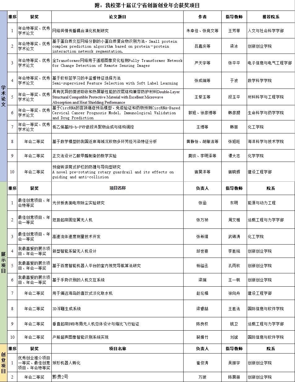 近日,辽宁省第十届大学生创新创业年会在沈阳圆满落幕。本次年会由辽宁省教育厅主办,沈阳理工大学承办,主题为“奋力振兴新突破、创新创业创未来”。来自全省59所高校的师生共聚一堂,交流大学生创新创业教育成果。我校喜获年会特等奖6项、一等奖8项,二等奖8项。获优秀学术论文7篇、最佳创意项目4项、最喜爱展示项目3项、优秀创业推介项目1项,14位指导教师获评优秀指导教师。我校推荐的所有作品全部获奖,学术论文连续4年作为优秀年会论文代表在闭幕式展示交流。