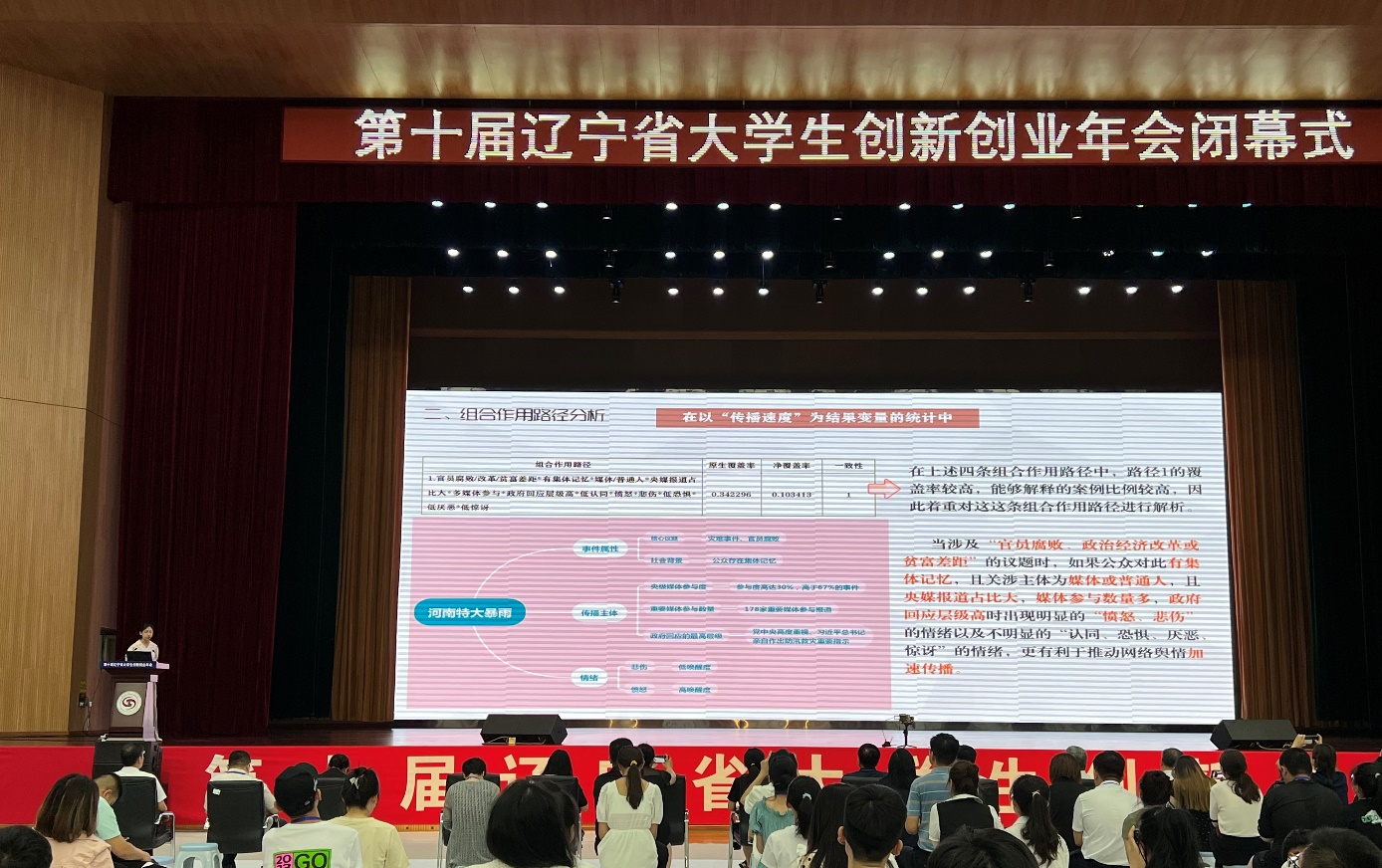 本次年会经过学校推荐申报、专家组初评、省创指委专家复审、会审等环节,共有457项作品入选年会进行现场交流和展示,代表了全省各高校最新最高的创新创业教育成果。我校人文与社会科学学部王芳菲副教授指导、本科生朱幸佳撰写、张竞文汇报答辩的论文《网络舆情传播耦合演化机制研究》获年会特等奖,并作为优秀学术论文代表在年会闭幕式以主题报告形式展示项目研究成果。