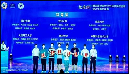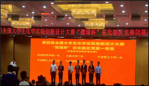 7月4日—6日在黑龙江大学举办的东北赛区比赛中,大连理工大学选送的三支队伍中程嘉硕、孟祥玉和邓可妍组成的多彩超铜变变变队(新创实验,指导教师:王秀云、倪钧)和王一鸣、吴浩宇、赵铭宇组成的“EDTA铁钠攻坚”队(改进实验,指导教师:王秀云、宿艳)均荣获东北赛区一等奖,由舒适、张师卓、刘鑫磊组成的“Chem DSSC”(科普实验,指导教师:于泽、潘玉珍)获东北赛区二等奖。多彩超铜变变变队在第一轮小组答辩中排名第一,成功晋级全国总决赛,并斩获特等奖。