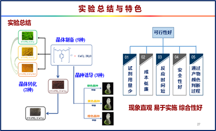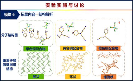 获奖作品为多彩超分子铜配合物制备实验,该实验项目将学科前沿超分子化学理论引入本科实验教学,开创了探讨关于分子间氢键等相互作用的实验内容,以价格低廉的[氮,氮-双(2-氰基乙基)氨基]吡啶盐酸盐(简称CEAP盐酸盐)为配体,通过调控溶剂极性、离子浓度等改变微环境,从而制备具有不同超分子结构的铜配合物。尤其通过Jahn-Teller效应可使得铜配合物具有不同的颜色,从而将复杂的超分子结构具象化和可视化。该新创实验层次化设置了晶体制备、晶体转化、晶种诱导结晶等实验内容,拓增了结构解析内容,实验现象直观、色彩丰富、内容前沿、技术先进,易于实施,是非常理想的本科生教学实验。