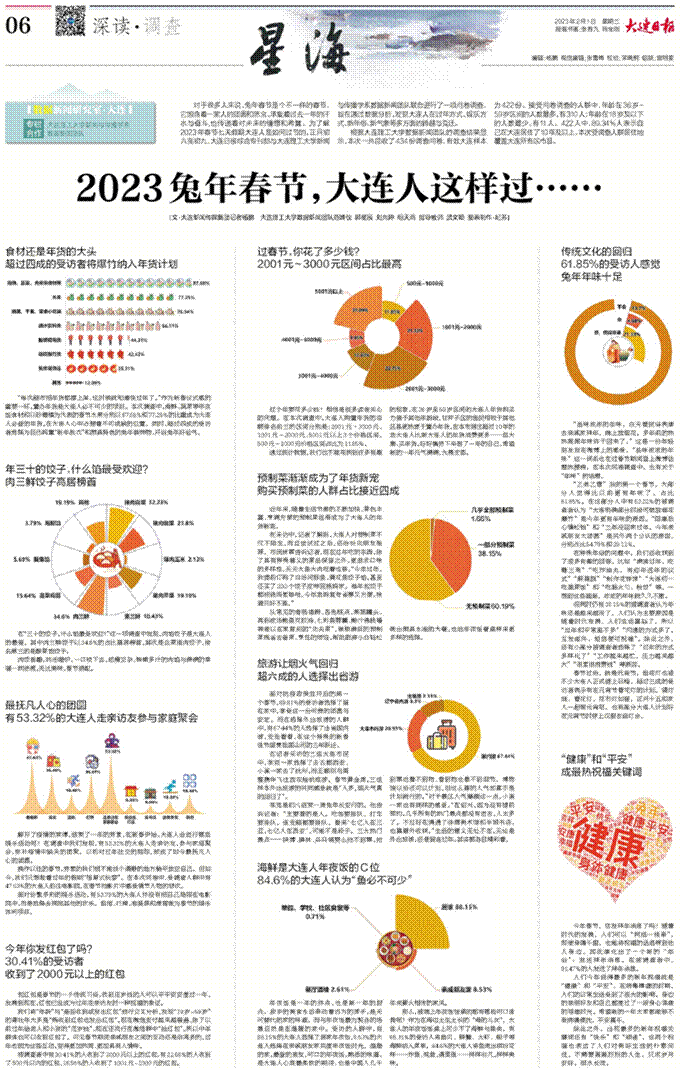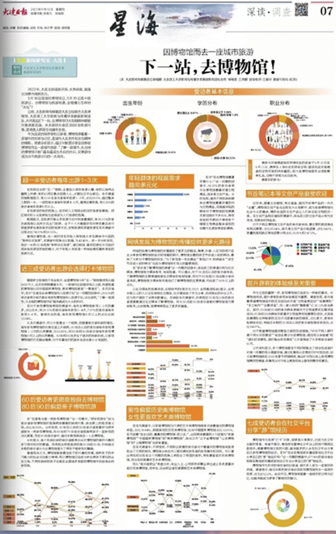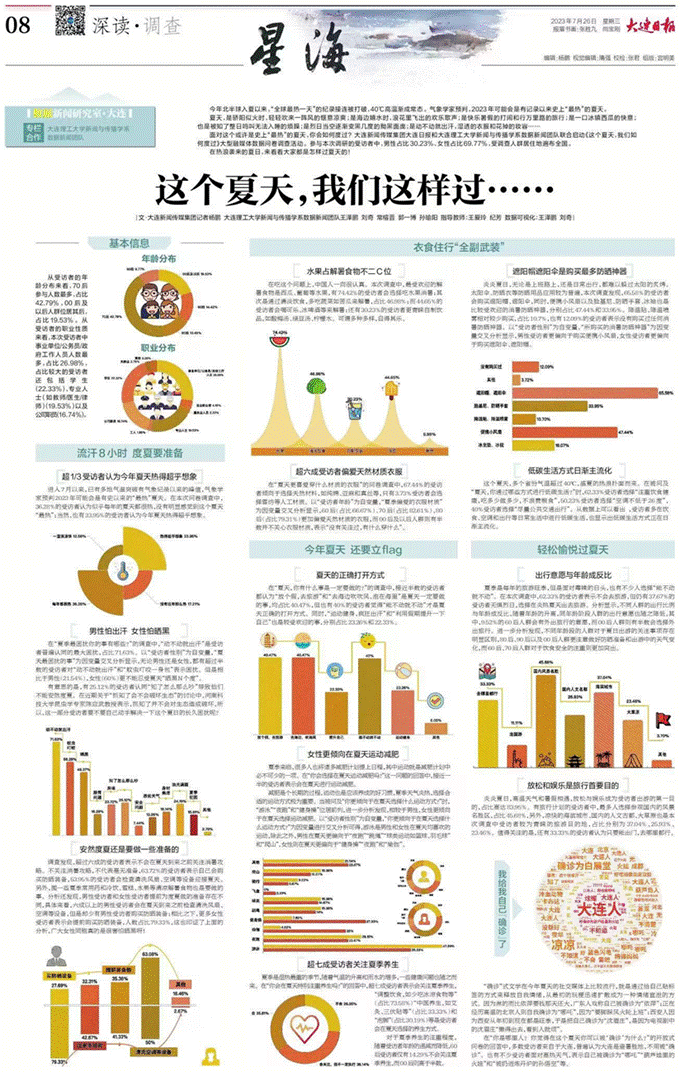 数据新闻团队自2023年初与大连新闻传媒集团深度开展“校媒”融合协作以来,以大连市民为主要调查对象并覆盖全国,已针对“‘未阳’人群的防疫习惯”、“兔年春节如何过”、“为雷锋画像”、“阅读习惯”、“博物馆+旅游”、“青年学子毕业留连情况”、“暑假经济”、“大连马拉松赛”、“数字时代老年生活”、“理想街区”、“热搜中的大连”12个话题开展了调查与调研,在大连日报纸媒及大连日报官方微信公众号连续发表12期数据新闻作品,并被新闻大连、大观新闻、半岛晨报、大工融媒等微信公众号及大连理工大学官网、辽事通APP和其他媒体平台转载,创新性地将大连的社会民生、文化建设、行业前沿等领域以“新闻+数据+可视化”的形式呈现,引发媒体行业的关注及社会的热烈反响,阅读量累计超过10万人次。
