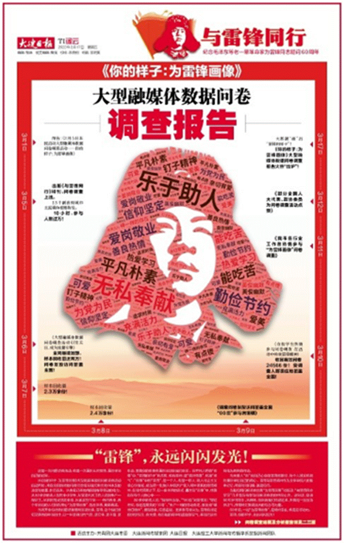 其中, 2023年全国“学雷锋日”前夕进行的“为雷锋画像”大型融媒体调查上线后,获13个副省级城市主流媒体相继转发,10小时后参与人数过万,全网收回有效问卷24566份,受调查人群居住地覆盖全国,受调查人群覆盖老年群体到大中小学生的各年龄段,获得全国人大代表、政协委员的点赞,基于问卷调查结果撰写的资政报告《新时代传承和弘扬雷锋精神的建议》获得中央网信办资政采纳。