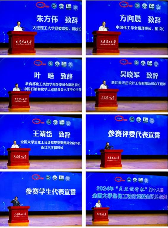 8月20日,总决赛开幕式在我校学生文化中心剧场举行。大连理工大学党委常委、副校长朱方伟致欢迎词,中国化工学会副理事长、秘书长方向晨代表大赛主办方致辞,教育部化工类教学指导委员会副秘书长、中国石油和化学工业联合会人才中心主任叶皓,浙江省天正设计工程有限公司总工程师吴晓军,化工设计竞赛委员会秘书长、浙江大学副校长王靖岱分别致辞。天津大学项文雨老师、大连理工大学李文智同学分别代表大赛评委和参赛学生宣誓。在校旗入场仪式后,全国总决赛正式启动。开幕式由大连理工大学化工学院院长刘涛主持。