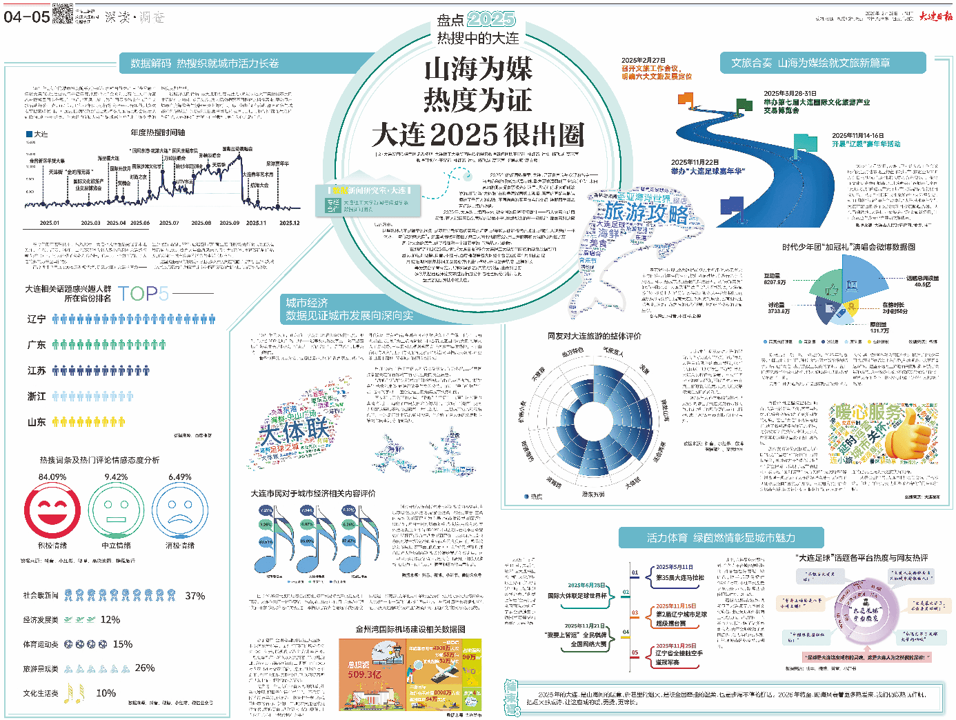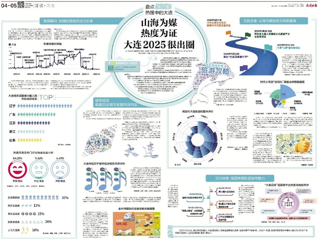 数字为笔,勾勒城市活力脉络;温度为墨,书写滨城烟火故事。2025年12月23日,《山海为媒,热度为证!大连2025很出圈!》数据新闻作品在大连日报深读·调查上以两个整版正式见刊,该数据新闻以精准的数据锚点、生动的叙事表达、温暖的民生视角,全景铺展年度大连相关话题的热度图景。这篇作品的背后,不仅依靠一套专业严谨的数据新闻制作流程,更凝聚着《高级新闻写作》课程校媒协同育人的实践力量。依托大连理工大学与大连新闻传媒集团日报中心共建的“数据新闻研究室”,该课程引领学子将镜头对准民生百态、笔锋聚焦城市发展,2025年以12期高质量数据新闻作品,生动诠释了新文科人才培养的校媒协作新路径。