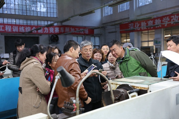 最后,国家级、工程训练中心主任梁延德教授以“关于工训VR建设与应用”为题,介绍了我校工程训练中心虚拟实验教学开展情况,并在车间内进行了现场演示,充分展示了“平面图纸立体化、机床设备透明化、安全教育生动化、户用终端手机化、两个现场零距离”的特点。参会教师认真地听取了梁老师的介绍,并饶有兴趣地拿出手机参与到虚拟实验互动中。