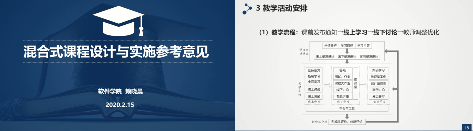 以软件学院为主导,校区在线授课教师参与,由赖晓晨副教授根据在校内较早开展混合式教学及其《计算机组织与结构》国家级在线金课建设经验,按照“以学生为本,一致对准”的教学理念,讲解并录制了《混合式课程设计与实施参考意见》的视频,从理论基础、设计理念、设计方法、设计内容,以及课前资源建设等5个方面,介绍了混合式教学模式的设计要点和落地方法。该视频由教务处推广到全校,做到资源共享,相互借鉴。
