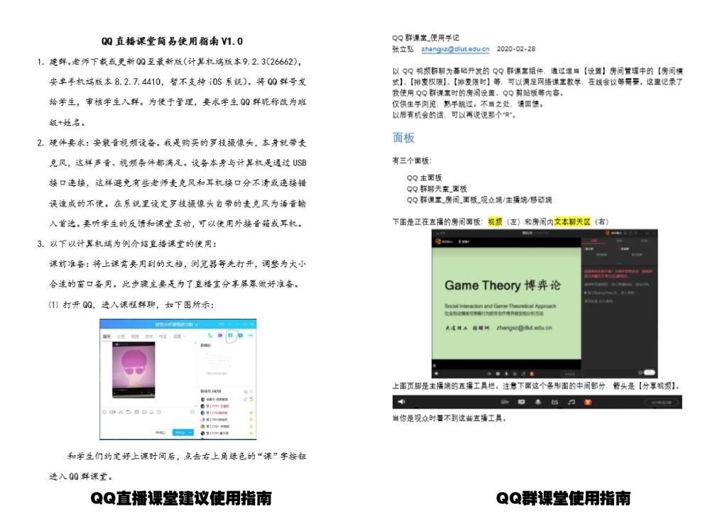 在线上教学工作开展过程中,学院教师展现出了很强的积极性、主动性和包容性,对学院给予了极大支持。例如,吴灏文老师经多方对比,找到一种利用QQ进行课程直播的好方法,并撰写《QQ直播课堂简易使用指南》,发布至学院教师线上教学交流群中供老师们参考;张醒洲老师根据自己的使用经验亲自撰写了《QQ群课堂使用手册》与老师们共享;其他老师在课程准备及教学过程中有了好的经验也都第一时间发布至群里分享。