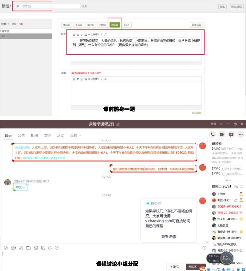在全院教师的大力支持和共同努下,学院顺利迎来了新学期线上教学第一周,全院共计60门线上课程顺利开课。学院教师通过大工-超星金课建设平台、智慧树、钉钉、QQ、企业微信等多种平台或工具,顺利完成了线上授课、课堂测验、作业布置、课程讨论小组分配、学生学习状况监测等环节,实现了云端教学模式与传统课堂模式的无缝衔接。