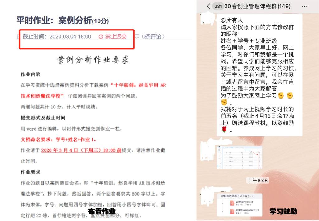 学院在上述工作方案及实施办法中强调,无论采用何种教学方式,均应继续坚持“课程思政”的要求,特殊时期更应发挥课程育人的作用。为此,学院推出了一系列保障措施,例如:成立了由学院院长朱方伟教授及学院党委书记叶鑫教授亲自挂帅的“线上教学质量保障委员会”;除根据教师教学发展中心下发通知要求可申请的研究生助教岗位外,学院为每门线上开课的课程额外提供一个研究生助教岗位并予以资助,且不受选课学生数限制;为保障部分家庭经济困难学生使用手机流量完成线上课程,学院特设立线上授课期间 100 元/月/生的专项流量资助;学院积极征集用于帮助主讲教师和学生之间进行沟通与交流的微信群(或 QQ 群)信息,并形成线上授课明细及学生线上平台使用说明等文件及时下发给学生。