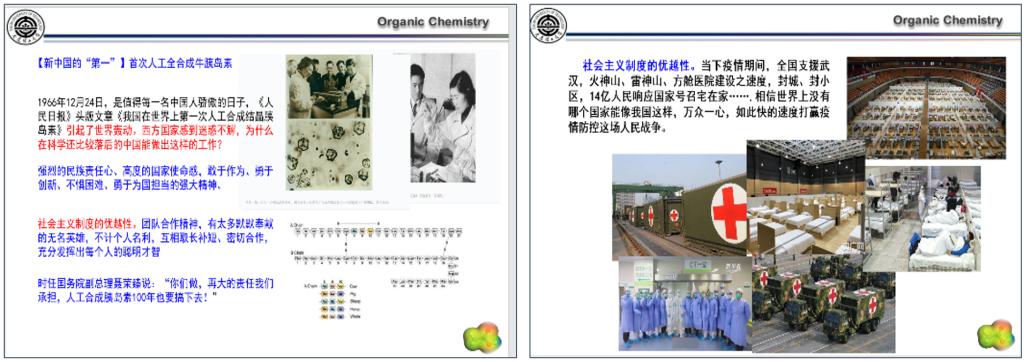 团队教师们在线讲解多肽的结构测定时,引入【新中国的“第一”】首次人工全合成牛胰岛素的案例,向同学描绘出我国科技工作者是在怎样的艰难条件下,如何克服重重困难,在世界上第一次人工合成出结晶胰岛素引起了世界轰动的历史画面。西方国家感到迷惑不解,为什么在科学还比较落后的中国能做出这样的工作?它依靠科研人员强烈的民族责任心、高度的国家使命感,依靠科研人员敢于作为、勇于创新、不惧困难的强大精神,依靠党的领导和社会主义制度的优越性。案例联系实际拓展到当下疫情期间,全国支援武汉,火神山、雷神山、方舱医院建设之速度,封城、封小区,14亿人民响应国家号召凝心聚力,以拳拳爱国心快速、精准投入这场疫情防控的人民战争。