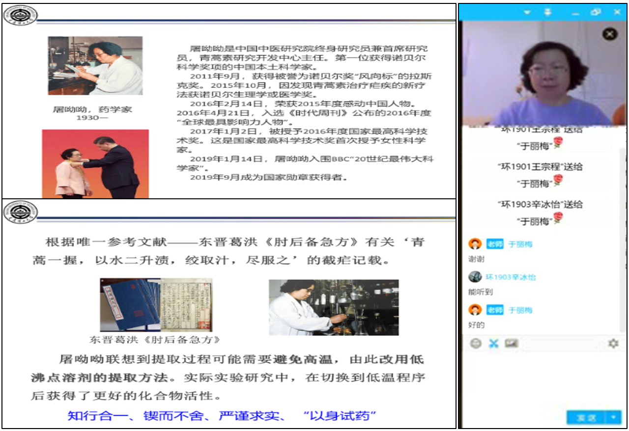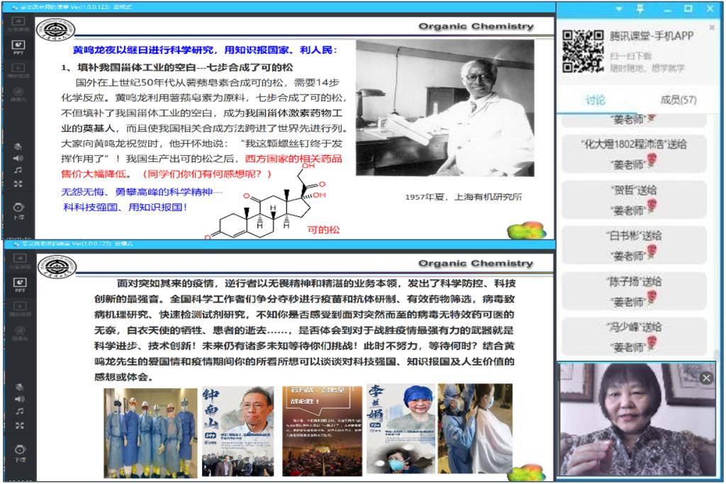 团队负责人、辽宁省姜文凤教授在线讲解醛酮还原反应时,引入“黄鸣龙改良还原法”的发现过程,延伸到黄鸣龙的爱国情怀以及对国家和世界所做的科学贡献。由黄鸣龙的事迹引入到学生身临其境的当下疫情期间,逆行者们为国家,为人民所做出的贡献。疫情的逆行者以无畏精神和精湛的业务本领,发出了科学防控、的最强音。围绕科学工作者奋力研发疫苗和有效药物筛选,围绕科学强国、知识报国,谈体会和人生的价值。