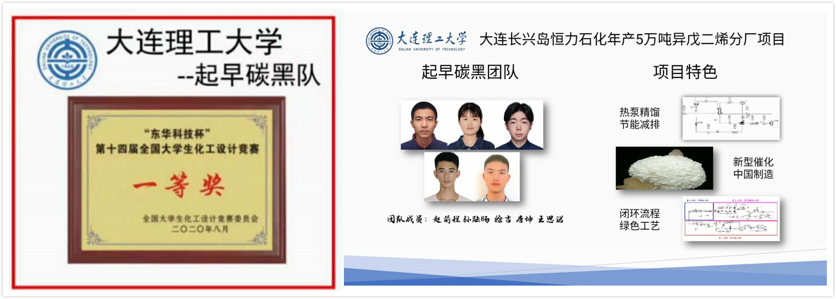 8月21日至23日,2020年“东华科技杯”第十四届全国大学生化工设计竞赛全国总决赛在合肥工业大学线上形式举行,全国共计367所高校的2323支队伍,11000余名学生报名参赛。经全国七大赛区角逐,甄选60支队伍进入全国总决赛。由大连理工大学化工学院的赵前程、徐吉、唐坤、孙陆旸、王思诺同学组成的“起早碳黑”团队(指导教师:何德民、关珺、周颖)在比赛中历经校内、地区赛选拔,晋级总决赛并获得全国总决赛一等奖。陈鸿杰、江敬哲、陶军锋、李盛西、尚柳康同学组成的“完美世界”团队荣获全国总决赛二等奖。