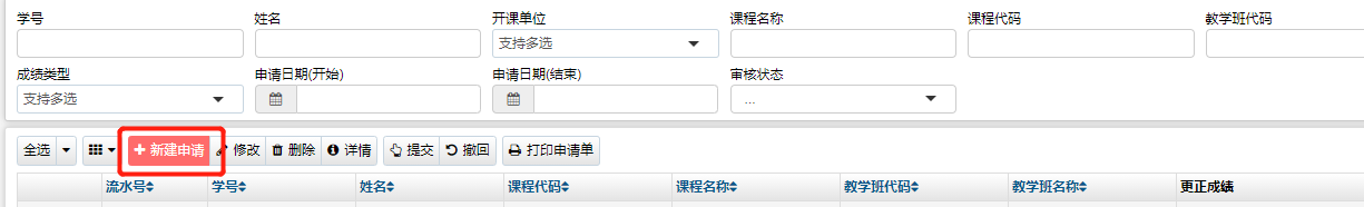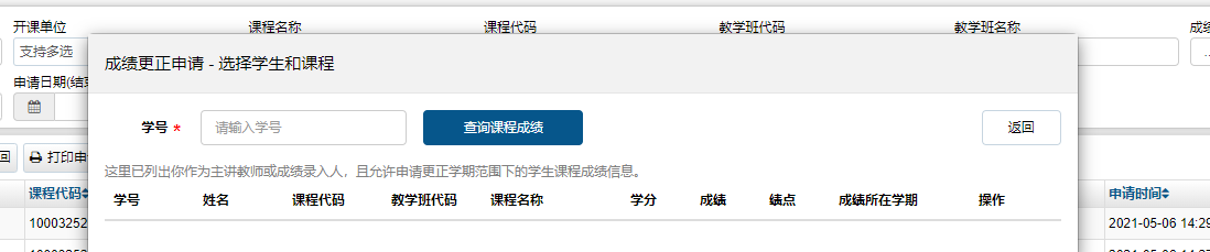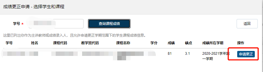4、输入学号:查询出该学生成绩,核对信息后点击“申请更正”;