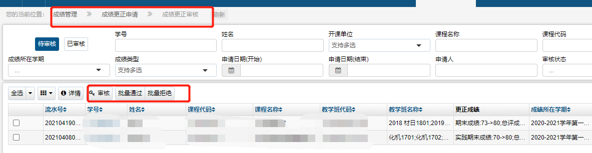4、主管教学的副部长、副院长负责审核本单位主讲教师提交的学生成绩更正申请,审核通过后,教务处进行最终审核。审核不通过的将在系统中退回。