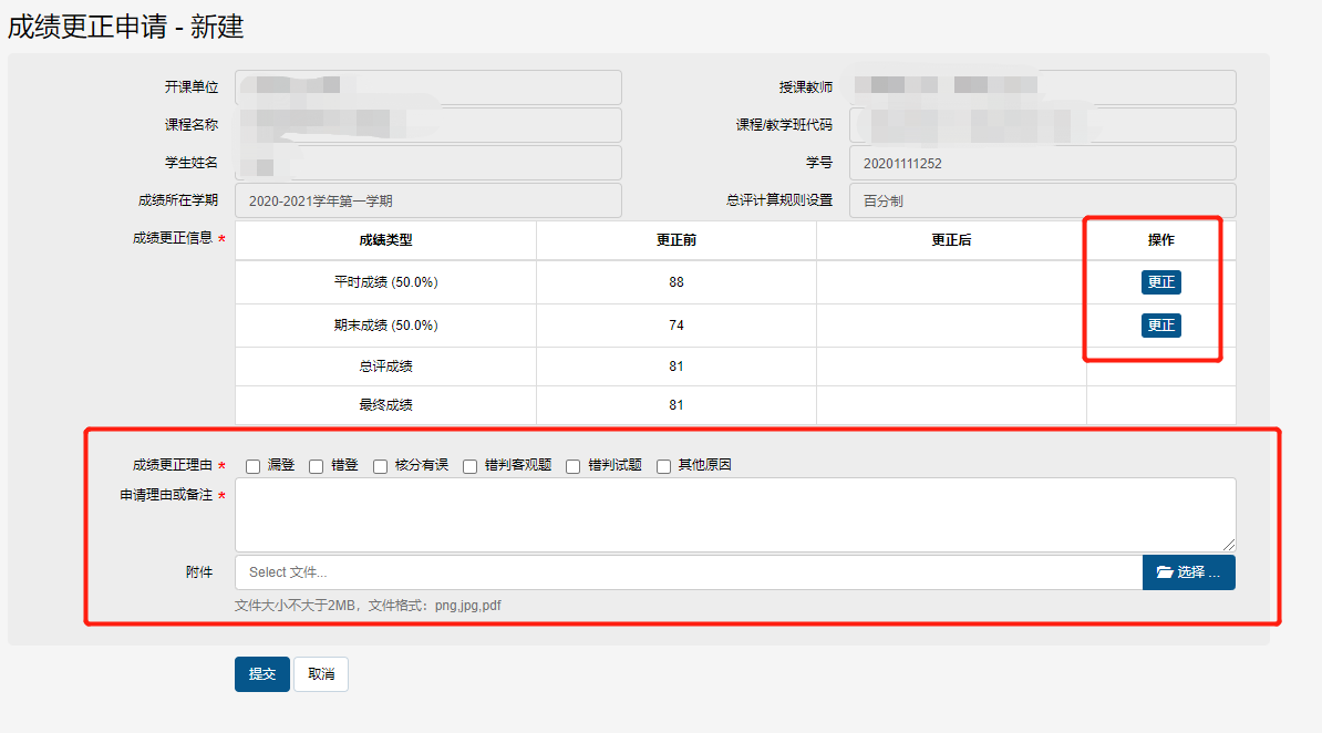 5、维护“成绩更正信息”、“成绩更正理由”、“申请理由或备注”、上传“附件”,提交成绩更正申请;