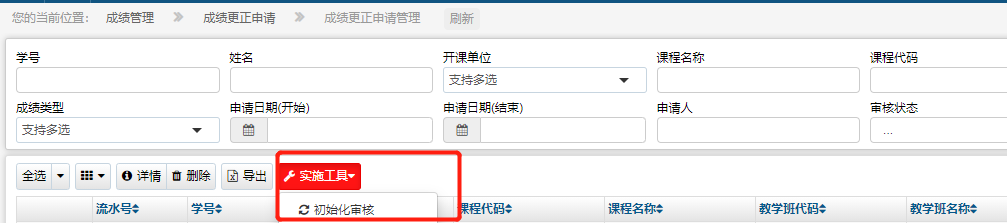 2、提供“实施工具”-“初始化审核”功能,系统会将已勾选的审核状态为已提交、审核中和不通过的申请记录初始化到已提交状态。