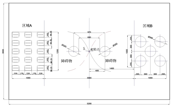 (3)搬运规则:从 A 区域搬运到 B 区域,两者间距为3000mm,货物在搬运过程中必须沿 S 形路线(如图 6 搬运场地区域划分图中粗实线或者虚线所示)绕过两障碍物,货物必须从两障碍物中间通过,且货物顶部离地高度不得超过障碍物高度,若比赛过程中撞倒障碍物或者将障碍物推离原来位置 50mm,比赛结束,搬运场地布置如图 6 所示,起升机构从B 区域到 A 区域没有路线要求。