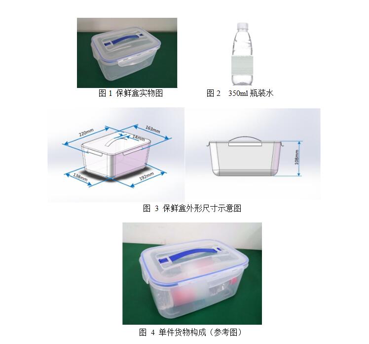 (1)搬运货物:单件搬运货物由一个保鲜盒内置2瓶平躺的350ml瓶装水构成。保鲜盒如图 1 所示(保鲜盒信息见附件一),其外形尺寸为:上表面(带卡扣宽度)220mm×163mm,底面 192mm×138mm,高为 108mm,上盖表面有提带(比赛时提带凸起,方便摘挂钩,叠放盒子后可压平),提带中部宽度为 14mm(如图 3 所示)。350ml 瓶装水如图 2 所示。每件货物如图 4 所示,其总质量约为 0.94kg(每件货物总质量为所购保鲜盒自重加 2 瓶原装 350ml 瓶装水质量之和,由于产品的批次不同 ,重量可能有一定的误差。比赛时采用原厂原装的 350ml 瓶装水和保鲜盒,不再进行重量调配。