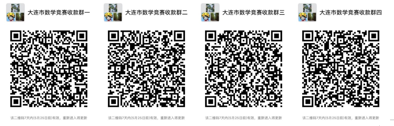 报名参赛的同学加入如下其中一个“大连市数学竞赛”微信群(前群满员加后群),入群截止时间:5月25日(周四)中午12:00(截止后不再接受报名)。