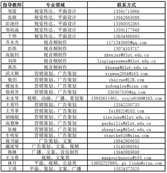 第十七届大学生广告艺术大赛大连理工大学选拔赛组委会提供有关指导老师的名单及联系方式,参赛同学可根据作品种类自行联系指导老师(请短信或邮件形式联系指导教师)。